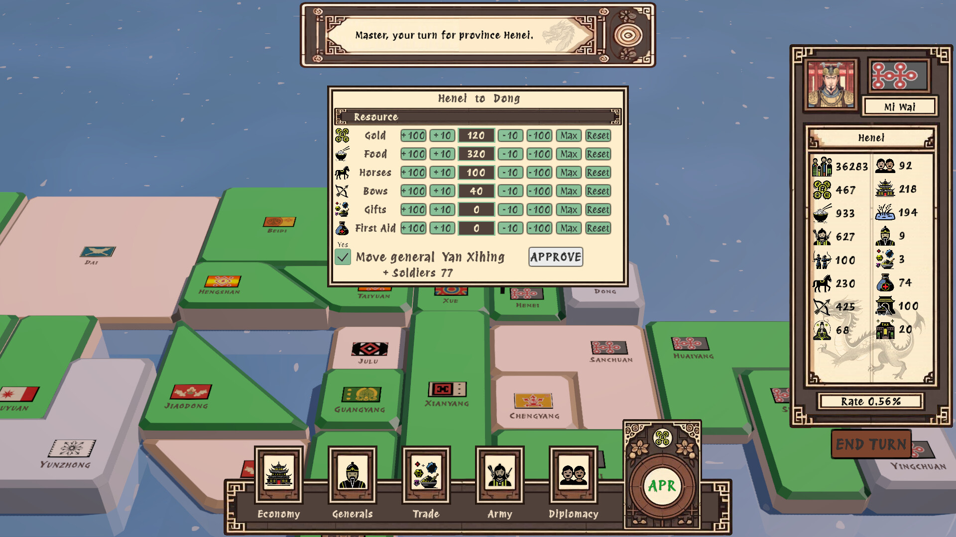 - 深度省份管理系统 – 管理包括士兵、粮草、农作物、战马、弓箭和兵器在内的多种资源。训练军队、犒赏将领、搜寻人才,并通过采矿、贸易与行商支援,扩展你的战争机器。