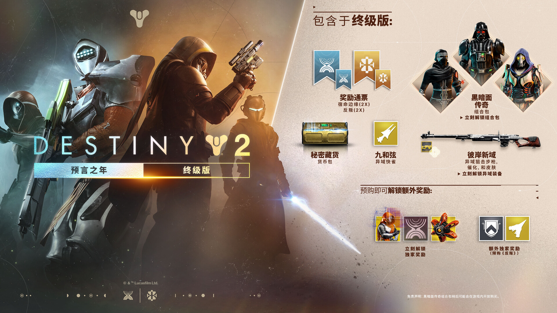 立即购买以解锁一系列预购奖励,包括《命运 2:宿命边缘》预购奖励(异域机灵和传说徽标),《命运 2:反叛》预购奖励(异域飞船和传说徽标,将于反叛发布前推出),还可立即解锁预购奖励(彼岸新域异域狙击步枪、预言之年异域动作表情,以及黑暗面传奇组合包)。