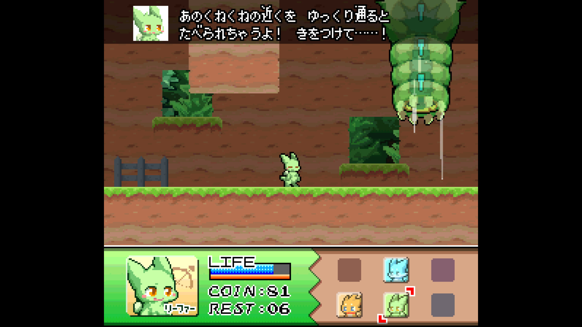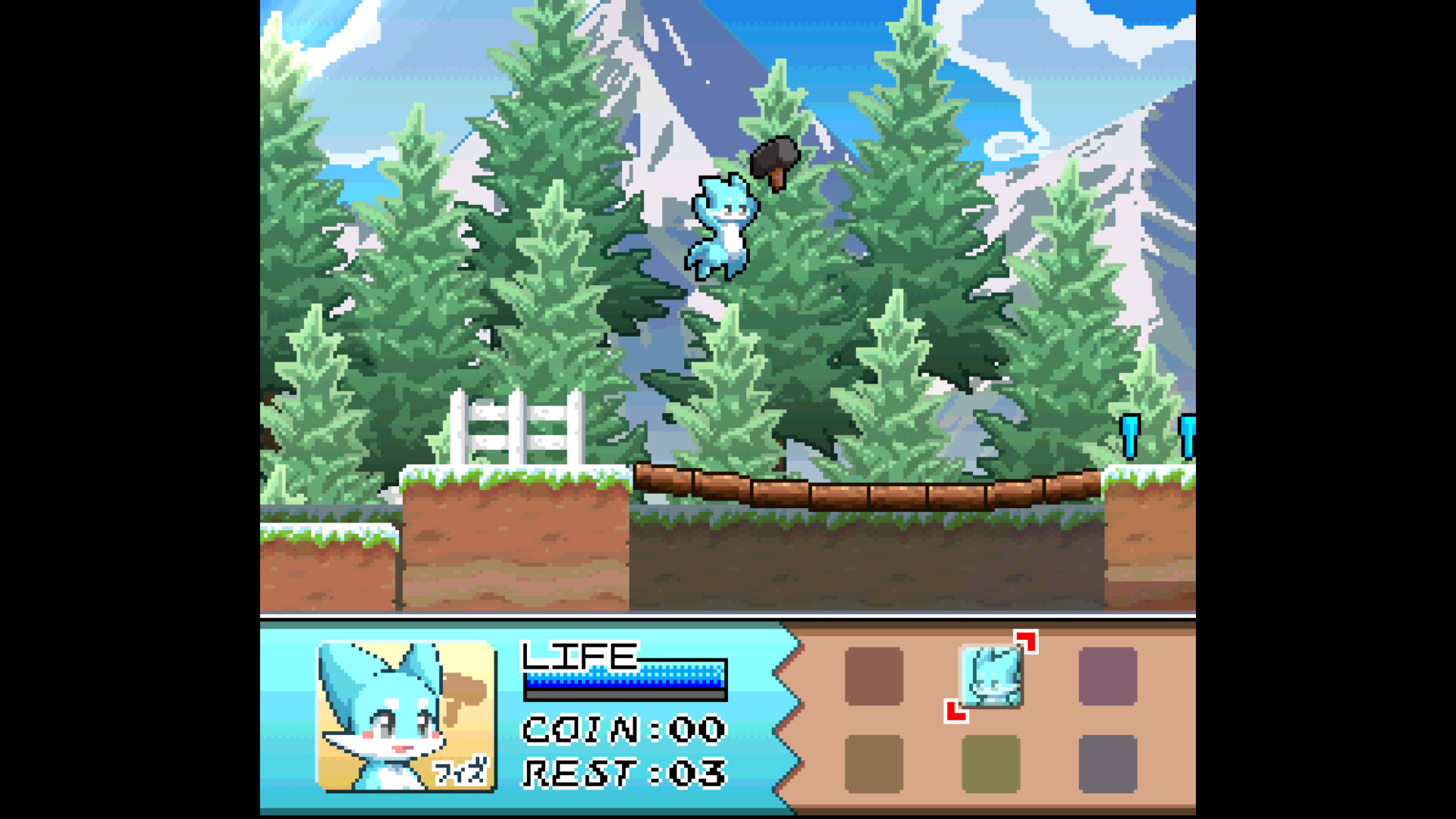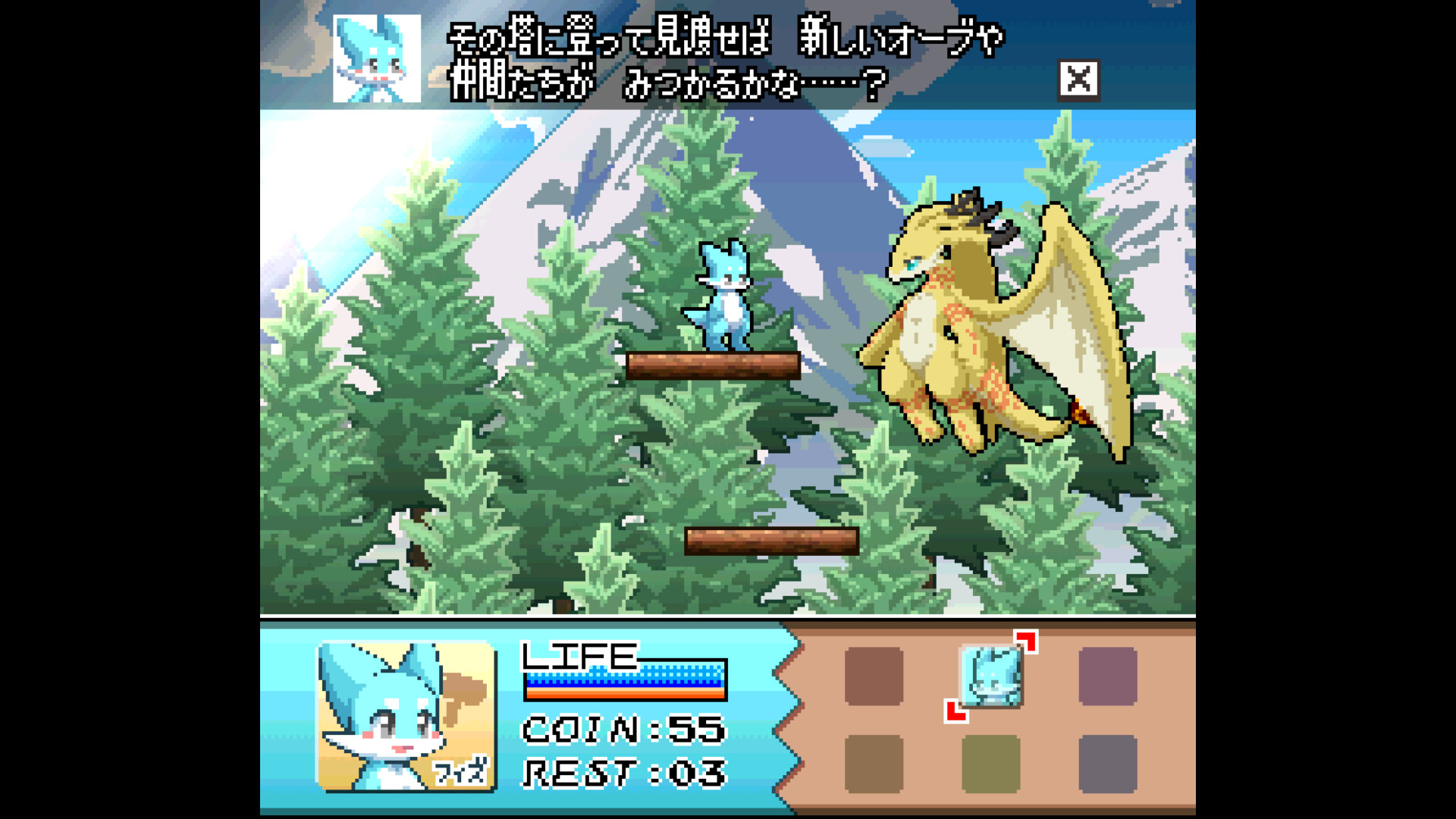 《菲兹与彩虹之星》是一款 2.5D 点阵图像动作游戏,玩家需要在前进过程中切换不同的小龙角色,各自拥有不同能力,应对各种挑战。作品中的“3D 护卫区”提供了独特的游戏体验:在保持 2D 图形与操作方式的同时,探索充满立体感的空间。