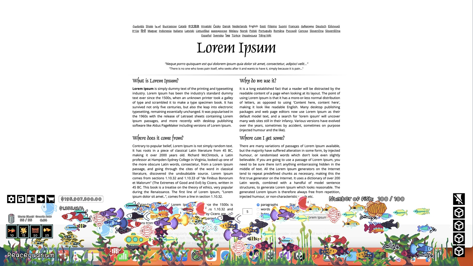 大量酷炫升级可供购买:一罐能让你召唤增益效果的蠕虫、收益提升升级、喂食力量提升升级、为当前水族箱自动喂食的潜艇、多个水族箱及容量升级、精美的背景以及令人平静的配色方案!