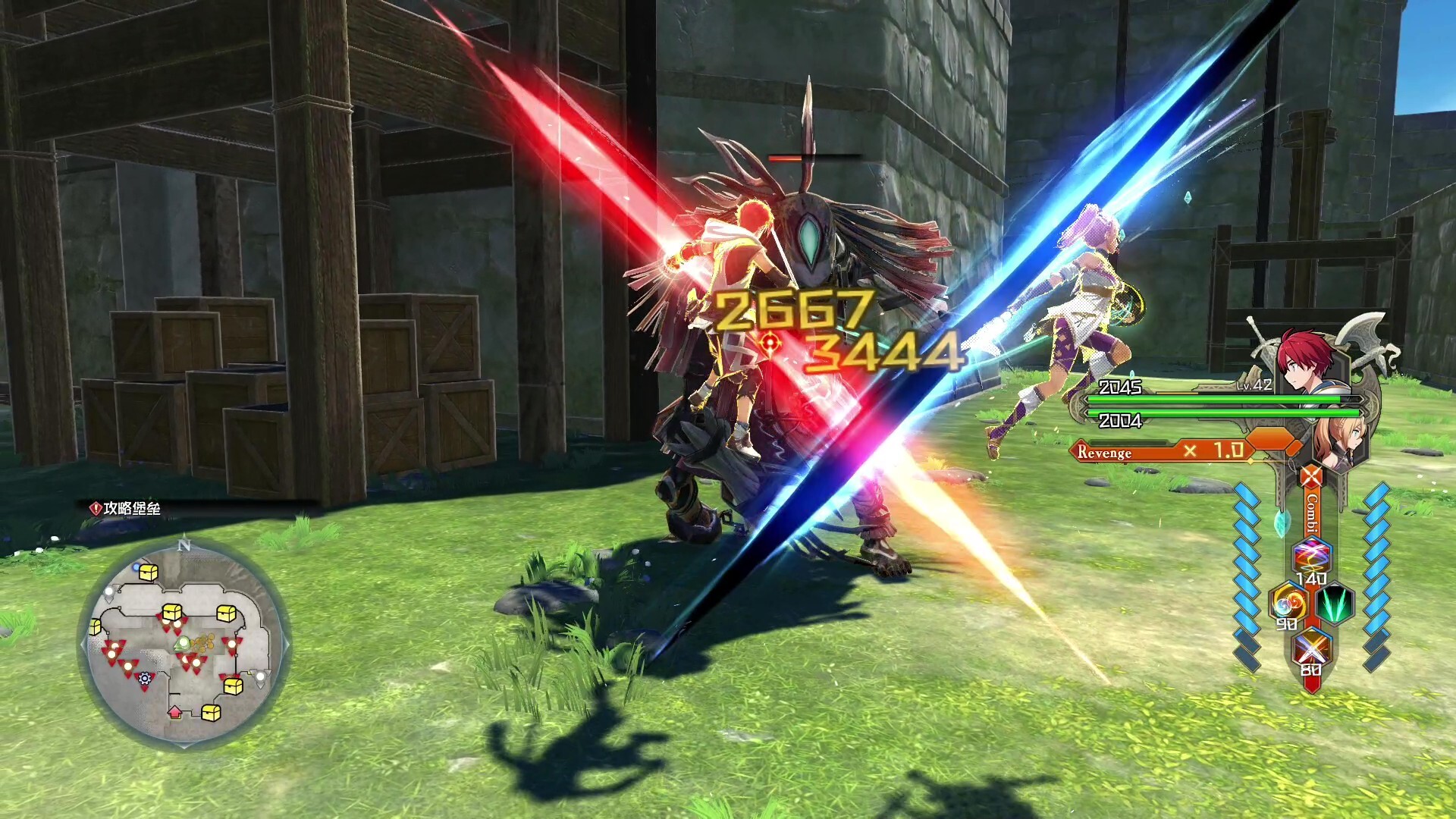 亚特鲁和卡嘉以交错的轨迹冲向敌人,施展 V 字形斩击的技能攻击。